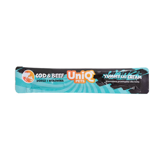 UniQ vlažne poslastice 15g×50 kom, kremasta poslastica za mačke, bakalar i govedina