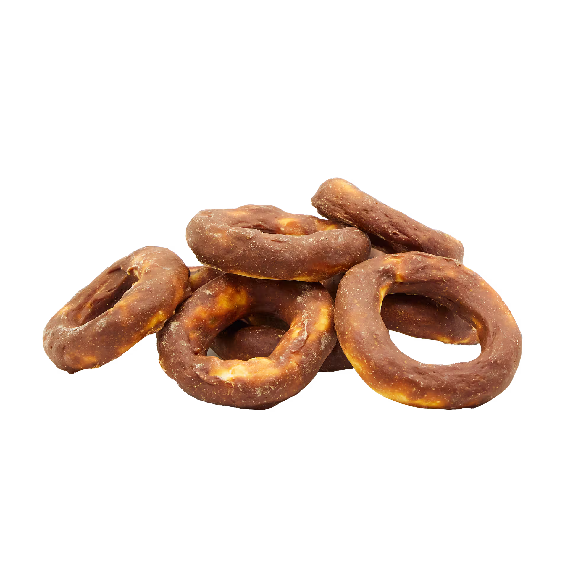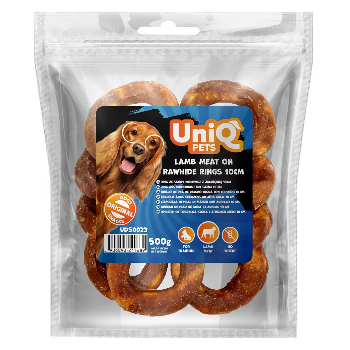 UNIQ poslastice za pse 500 g – jagnjeće meso na prstenovima od sirove kože (10cm)