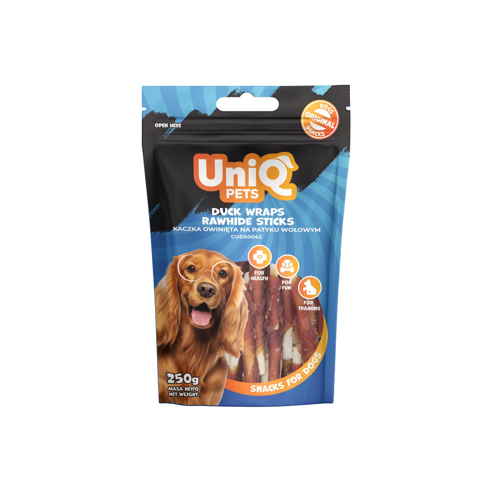 UniQ poslastice za pse, pačetina obmotana oko štapića od sirove kože